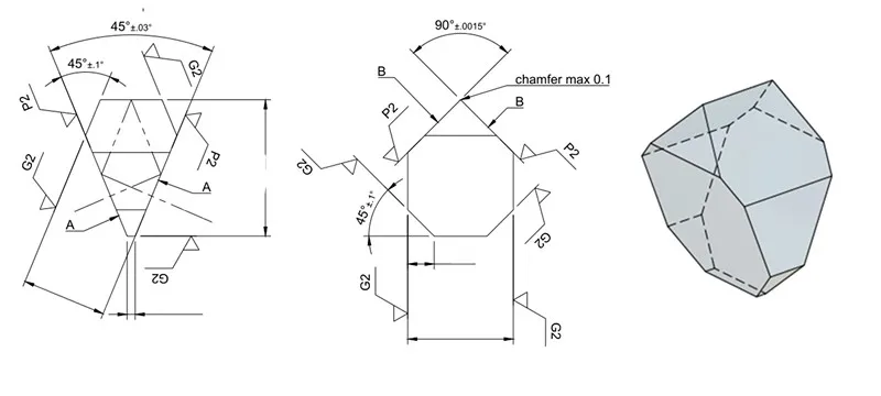 Schmidt prisms are used to invert and revert an image to angle of 45°. The 45° deviation makes Schmidt prisms useful in eyepiece assemblies and imaging systems requiring a path bend. The aluminized roof surfaces enhance the overall efficiency while the high accuracy roof angle tolerance increases the prism’s resolution. Used in Binoculars, Microscopes and Survey Equipment.